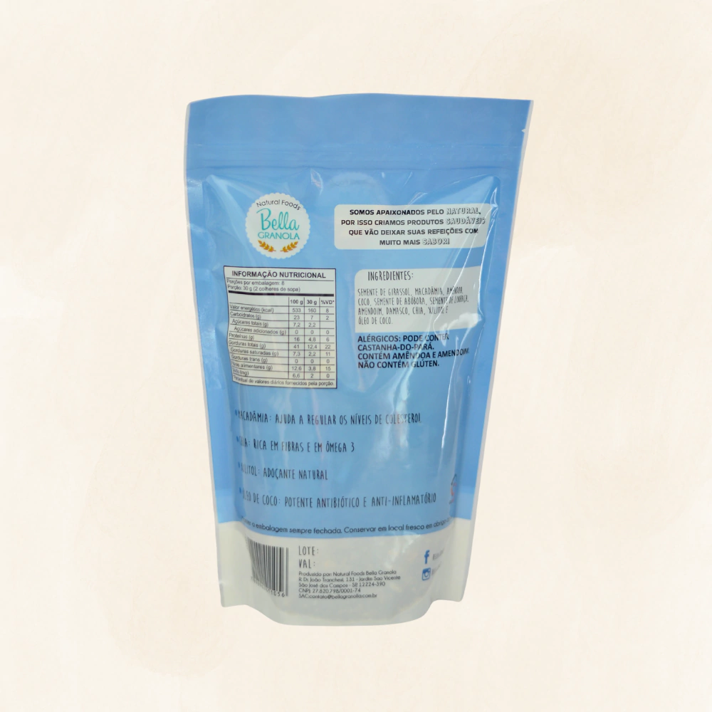 INGREDIENTES: Semente de girassol, amêndoa, macadâmia, coco em lascas, semente de abóbora, semente de linhaça, amendoim, damasco, edulcorante natural xilitol e óleo de coco extravirgem. Não contém glúten.