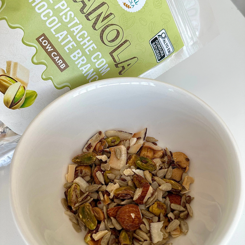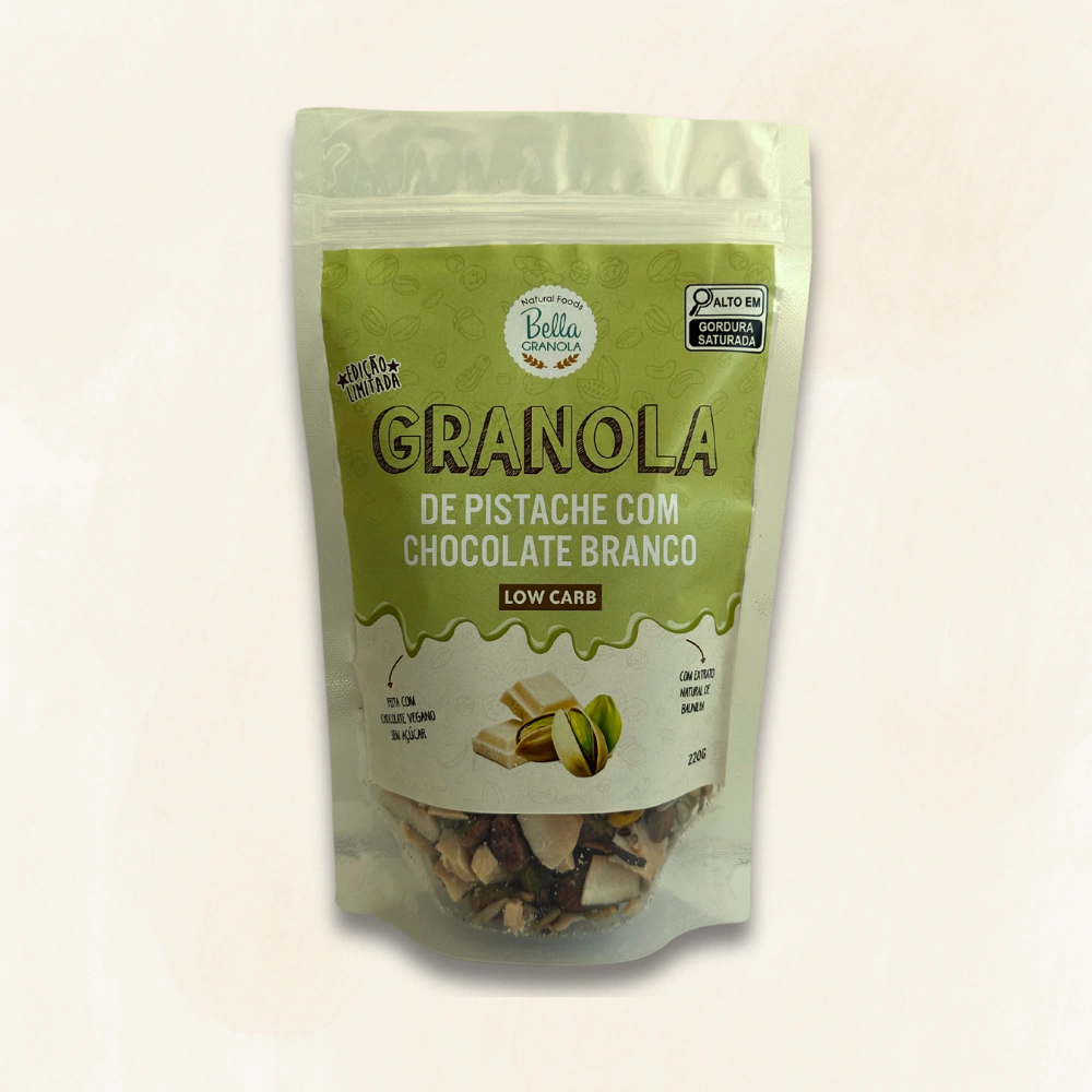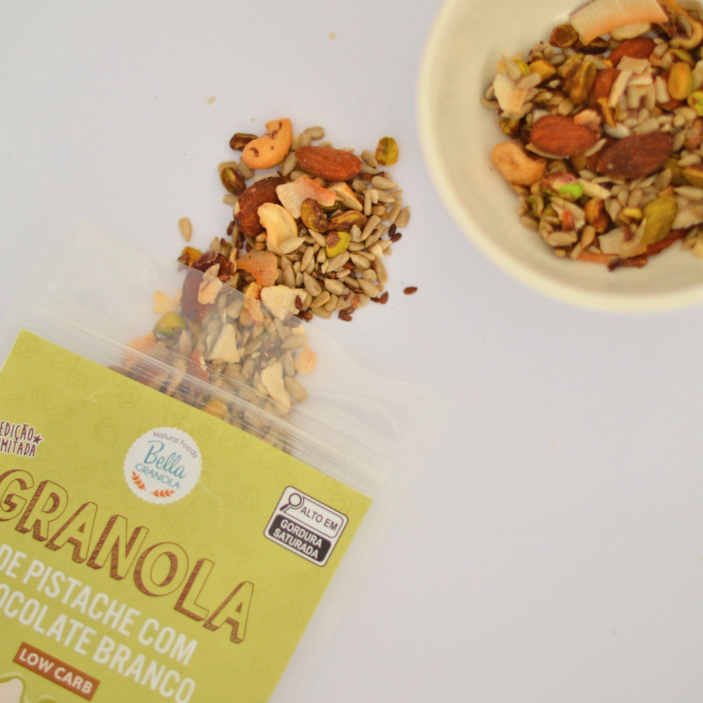 A combinação do pistache crocante com chocolate branco vegano resulta em uma granola irresistível — doce na medida, sem exageros, com ingredientes naturais e alto valor nutricional.