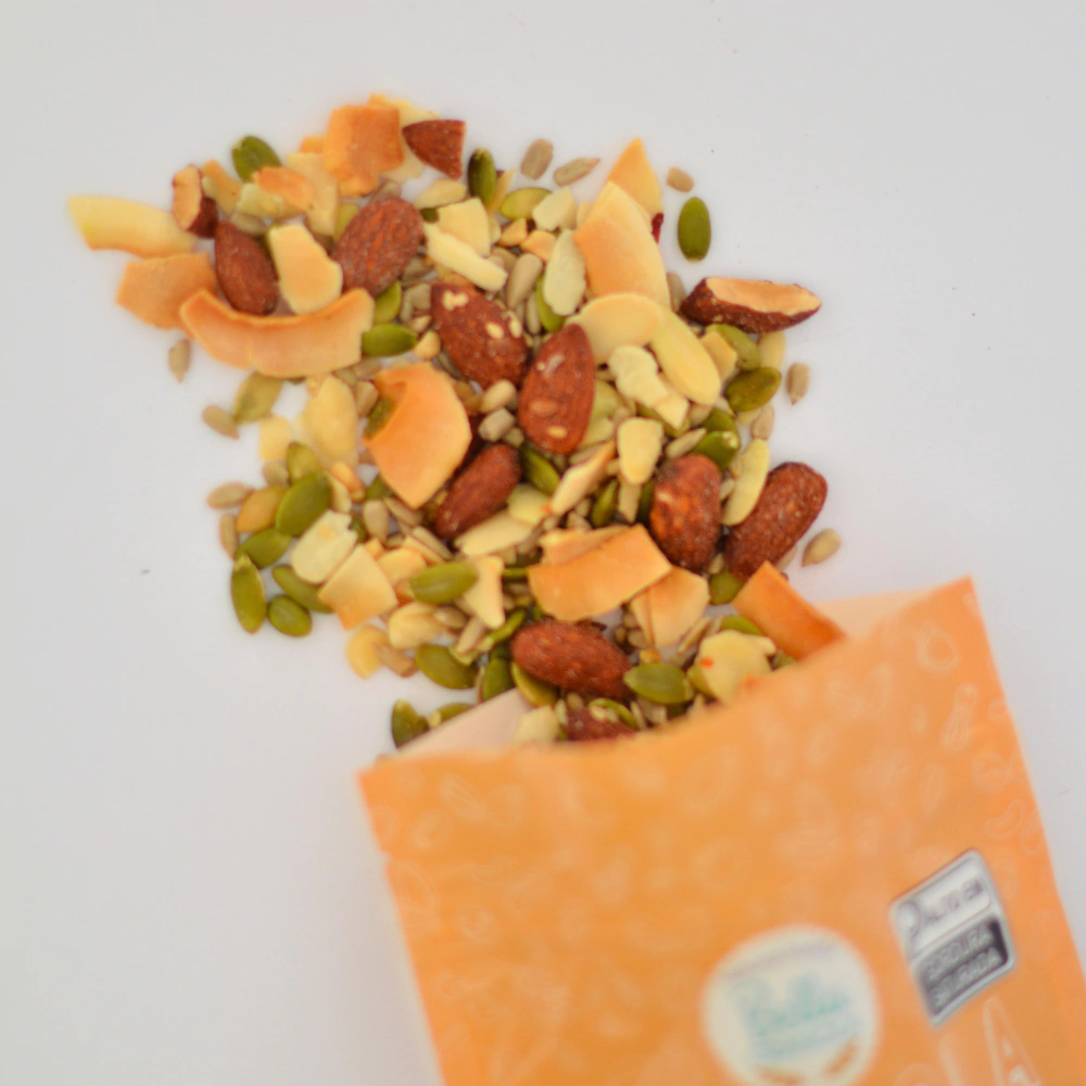 INGREDIENTES: Semente de girassol, semente de abóbora, amêndoa defumada, amêndoa laminada, gergelim, semente de linhaça, amendoim, castanha do Pará, coco em lascas, chimichurri, óleo de coco extravirgem e sal marinho. Não contém glúten.