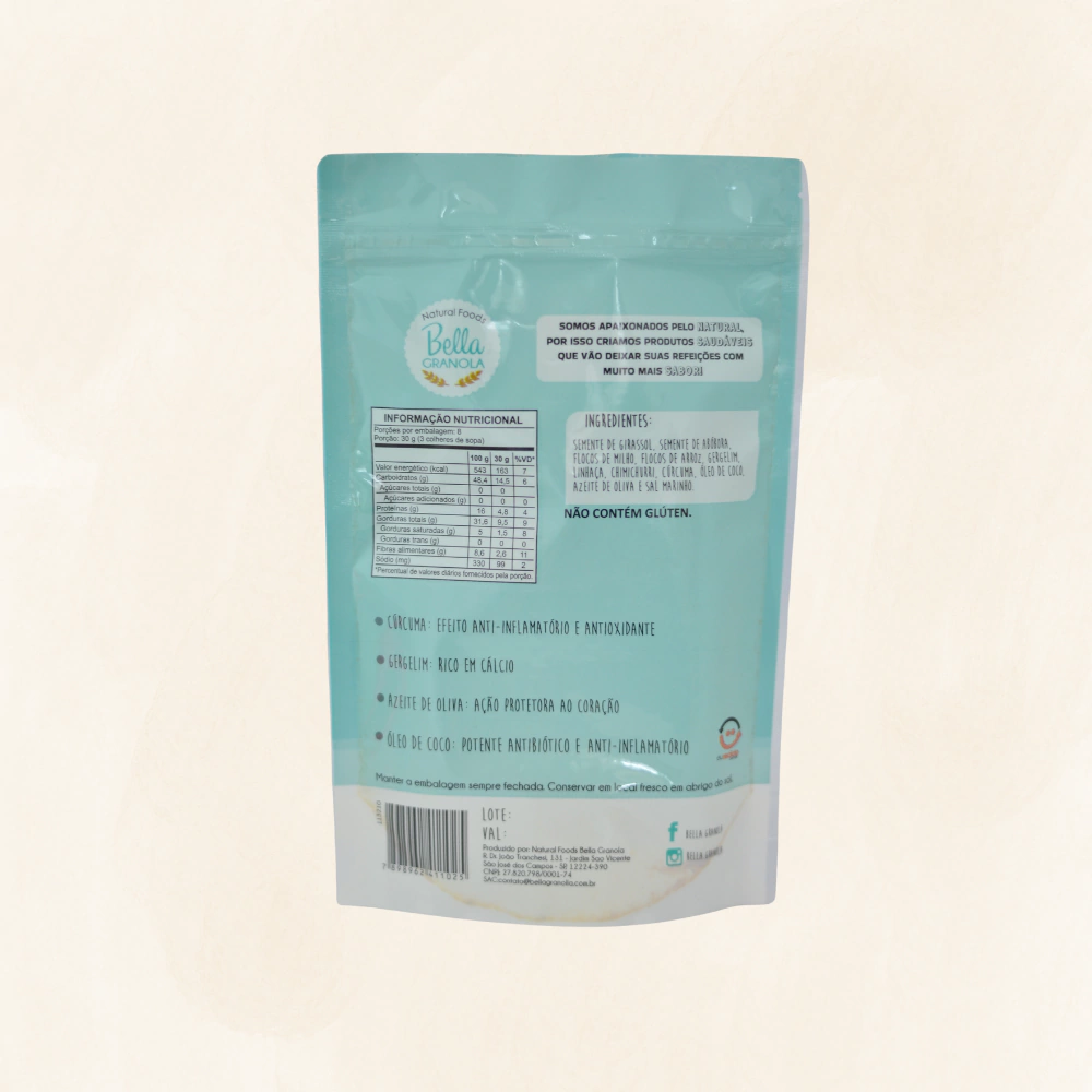 INGREDIENTES: Semente de girassol, semente de abóbora, flocos de milho, flocos de arroz, gergelim, semente de linhaça, chimichurri, cúrcuma, óleo de coco extravirgem, azeite de oliva extravirgem e sal marinho. Não contém glúten.